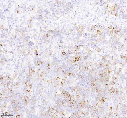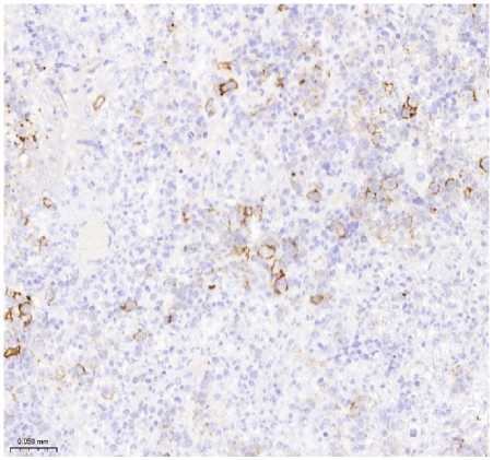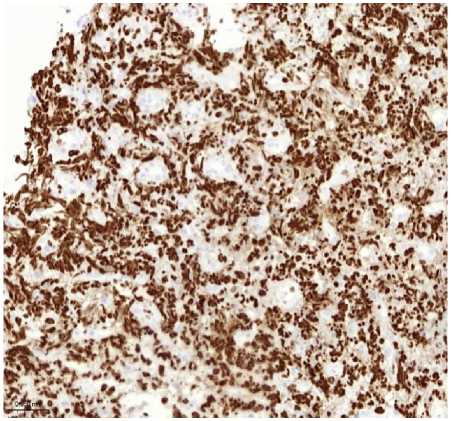 Иммуногистохимическое исследование (ИГХ): Опухолевые клетки экспрессировали CD138, CD38, MUM1/IRF4; EBER (ISH) - положительно. Отмечалась негативная экспрессия CD20, PAX5, CD3. Индекс пролиферации Ki-67 >90%.