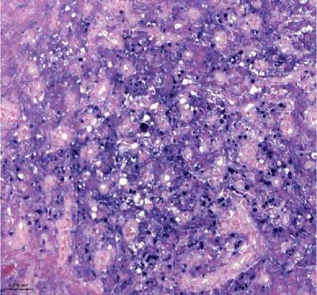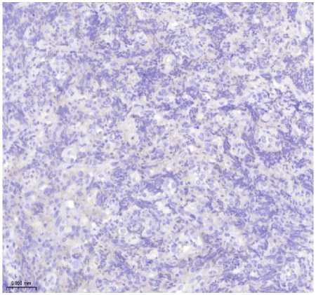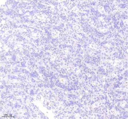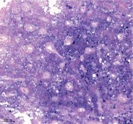 Гистологическое исследование: выявлен диффузный инфильтрат из крупных атипичных клеток с плазмобластным и иммунобластным фенотипом, ядрами неправильной формы, выраженным ядрышком и обильной базофильной цитоплазмой. Отмечались многочисленные фигуры митоза и обширные участки некроза.