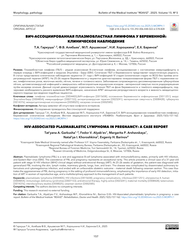 Плазмобластная лимфома (ПБЛ) – редкая агрессивная В-клеточная лимфома, ассоциированная с состояниями иммунодефицита, в первую очередь с ВИЧ-инфекцией и вирусом Эпштейна – Барр (EBV). Сочетание ПБЛ и беременности представляет казуистическую редкость. В статье представлено клиническое наблюдение пациентки 31 года с ВИЧ-инфекцией IV стадии (клиническая стадия по ВОЗ) без приёма антиретровирусной терапии (АРВТ). На 25–26 неделе беременности у пациентки диагностирована генерализованная форма ПБЛ с поражением кожи, лимфатических узлов, молочных желёз, лёгких, печени и головного мозга. Заболевание сопровождалось диссеминированным туберкулёзом лёгких, цитомегаловирусной инфекцией и завершилось неблагоприятным акушерским исходом – материнской смертью после родоразрешения путём кесарева сечения. Данный случай демонстрирует агрессивность течения ПБЛ на фоне беременности и тяжёлого иммунодефицита, подчеркивая необходимость раннего выявления ВИЧ-инфекции, назначения АРВТ женщинам репродуктивного возраста и важность междисциплинарного подхода при ведении подобных пациенток.
