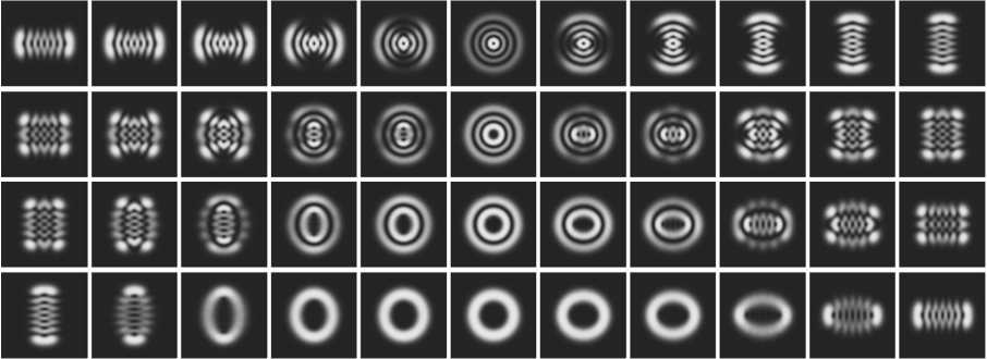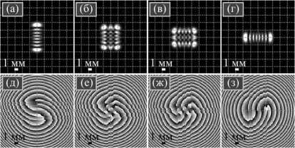 Для полноты картины заметим, что пучки АГ похожи (и по свойствам, и визуально по структуре распределения интенсивности) на пучки Эрмита– Лагерра–Гаусса [21 – 24], которые также зависят от некоторого вещественного параметра (степень астигматизма) и при его изменении преобразуются из пучков ЭГ в пучки ЛГ. В [25] теоретически, геометрически и экспериментально была показана связь между модами Эрмита–Лагерра–Гаусса и модами АГ.