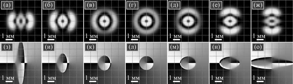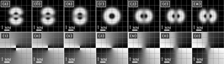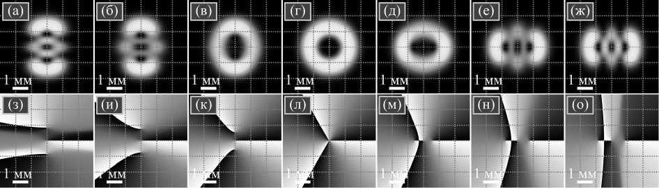 Рис. 3. Распределения интенсивности (а-ж) (чёрный цвет – ноль, белый цвет – максимум) и фазы (з-о) (чёрный цвет – 0, белый цвет – 2π) моды вАГ при (p, q) = (2, 2) для ε = –20 (а, з), –3 (б, и), –1 (в, к), 0 (г, л), 1 (д, м), 3 (е, н), 20 (ж, о)
