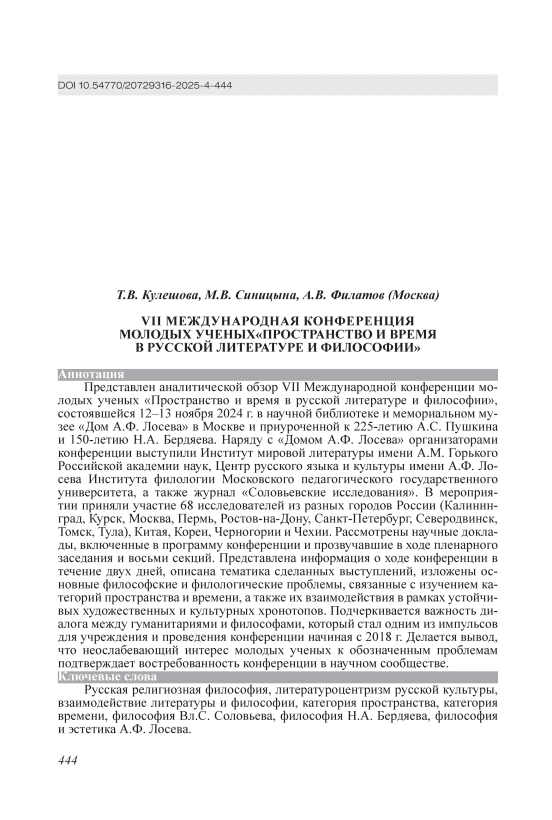 Представлен аналитической обзор VII Международной конференции молодых ученых «Пространство и время в русской литературе и философии», состоявшейся 12–13 ноября 2024 г. в научной библиотеке и мемориальном музее «Дом А.Ф. Лосева» в Москве и приуроченной к 225-летию А.С. Пушкина и 150-летию Н.А. Бердяева. Наряду с «Домом А.Ф. Лосева» организаторами конференции выступили Институт мировой литературы имени А.М. Горького Российской академии наук, Центр русского языка и культуры имени А.Ф. Лосева Института филологии Московского педагогического государственного университета, а также журнал «Соловьевские исследования». В мероприятии приняли участие 68 исследователей из разных городов России (Калининград, Курск, Москва, Пермь, Ростов-на-Дону, Санкт-Петербург, Северодвинск, Томск, Тула), Китая, Кореи, Черногории и Чехии. Рассмотрены научные доклады, включенные в программу конференции и прозвучавшие в ходе пленарного заседания и восьми секций. Представлена информация о ходе конференции в течение двух дней, описана тематика сделанных выступлений, изложены основные философские и филологические проблемы, связанные с изучением категорий пространства и времени, а также их взаимодействия в рамках устойчивых художественных и культурных хронотопов. Подчеркивается важность диалога между гуманитариями и философами, который стал одним из импульсов для учреждения и проведения конференции начиная с 2018 г. Делается вывод, что неослабевающий интерес молодых ученых к обозначенным проблемам подтверждает востребованность конференции в научном сообществе.