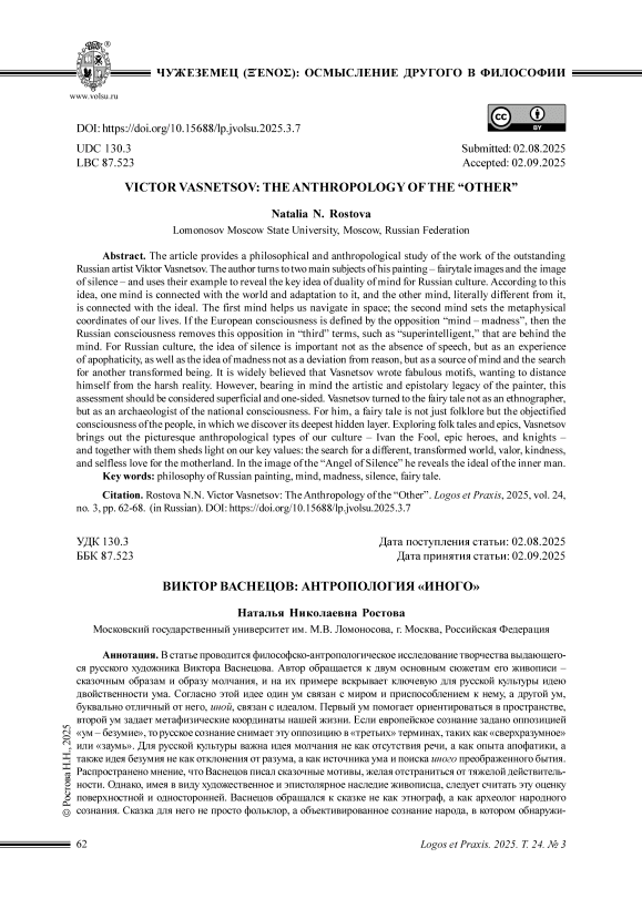 В статье проводится философско-антропологическое исследование творчества выдающегося русского художника Виктора Васнецова. Автор обращается к двум основным сюжетам его живописи – сказочным образам и образу молчания, и на их примере вскрывает ключевую для русской культуры идею двойственности ума. Согласно этой идее один ум связан с миром и приспособлением к нему, а другой ум, буквально отличный от него, иной, связан с идеалом. Первый ум помогает ориентироваться в пространстве, второй ум задает метафизические координаты нашей жизни. Если европейское сознание задано оппозицией «ум – безумие», то русское сознание снимает эту оппозицию в «третьих» терминах, таких как «сверхразумное» или «заумь». Для русской культуры важна идея молчания не как отсутствия речи, а как опыта апофатики, а также идея безумия не как отклонения от разума, а как источника ума и поиска иного преображенного бытия. Распространено мнение, что Васнецов писал сказочные мотивы, желая отстраниться от тяжелой действительности. Однако, имея в виду художественное и эпистолярное наследие живописца, следует считать эту оценку поверхностной и односторонней. Васнецов обращался к сказке не как этнограф, а как археолог народного сознания. Сказка для него не просто фольклор, а объективированное сознание народа, в котором обнаруживается его самый глубинный потаенный слой. Исследуя народные сказания и эпосы, Васнецов выводит живописные антропологические типы нашей культуры – Ивана-дурака, богатырей и витязей, а вместе с ними проливает свет на наши ключевые ценности – искание иного, преображенного царства, доблесть, доброту и самоотверженную любовь к родине. В образе «Ангела молчания» он приоткрывается идеал внутреннего человека.