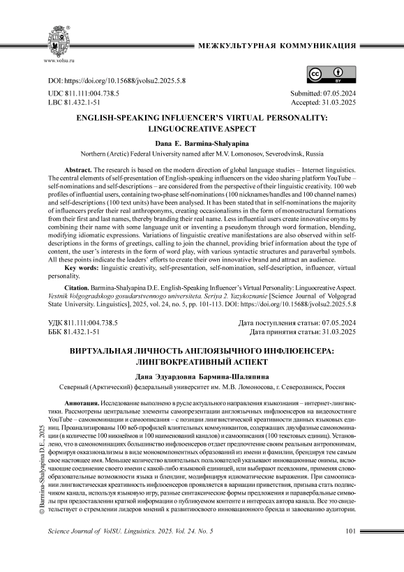 Исследование выполнено в русле актуального направления языкознания – интернет-лингвистики. Рассмотрены центральные элементы самопрезентации англоязычных инфлюенсеров на видеохостинге YouTube – самономинации и самоописания – с позиции лингвистической креативности данных языковых единиц. Проанализированы 100 веб-профилей влиятельных коммуникантов, содержащих двухфазные самономинации (в количестве 100 никнеймов и 100 наименований каналов) и самоописания (100 текстовых единиц). Установлено, что в самономинациях большинство инфлюенсеров отдает предпочтение своим реальным антропонимам, формируя окказионализмы в виде монокомпонентных образований из имени и фамилии, брендируя тем самым свое настоящее имя. Меньшее количество влиятельных пользователей указывают инновационные онимы, включающие соединение своего имени с какой-либо языковой единицей, или выбирают псевдоним, применяя словообразовательные возможности языка и блендинг, модифицируя идиоматические выражения. При самоописании лингвистическая креативность инфлюенсеров проявляется в вариации приветствия, призыва стать подписчиком канала, используя языковую игру, разные синтаксические формы предложения и паравербальные символы при предоставлении краткой информации о публикуемом контенте и интересах автора канала. Все это свидетельствует о стремлении лидеров мнений к развитиюсвоего инновационного бренда и завоеванию аудитории.