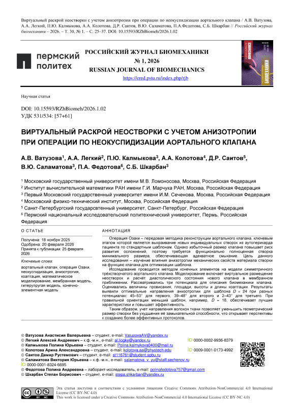 Операция Озаки – передовая методика реконструкции аортального клапана, ключевым этапом которой является выкраивание новых индивидуальных створок из аутоперикарда пациента по стандартным шаблонам. Однако избыточный размер клапана повышает риск развития осложнений, поэтому требуется функционально полноценная створка минимального размера, обеспечивающая адекватное смыкание. Цель данного исследования – изучение влияния анизотропии механических свойств материала створки на функцию клапана для оптимизации шаблона. Исследование проводится методом конечных элементов на модели симметричного трёхстворчатого аортального клапана. Моделирование включает виртуальное размещение неостворок и расчёт диастолического состояния нового клапана в мембранном приближении. Рассматривались три потенциала для описания биомеханики клапана. Оценивались величины провисания, площади, высоты и длины коаптации. Результаты выявили оптимальные направления анизотропии для шаблона D = 24 при разных потенциалах: 45–53° для первого, 39–48° для второго и 2–43° для третьего. При правильной ориентации меньший шаблон, например, D = 18, обеспечивает лучшие характеристики и повышает эффективность. Таким образом, учет направления волокон ткани позволяет уменьшить геометрический размер створки без ухудшения её замыкательной способности, что открывает перспективы к созданию более эффективных протоколов.