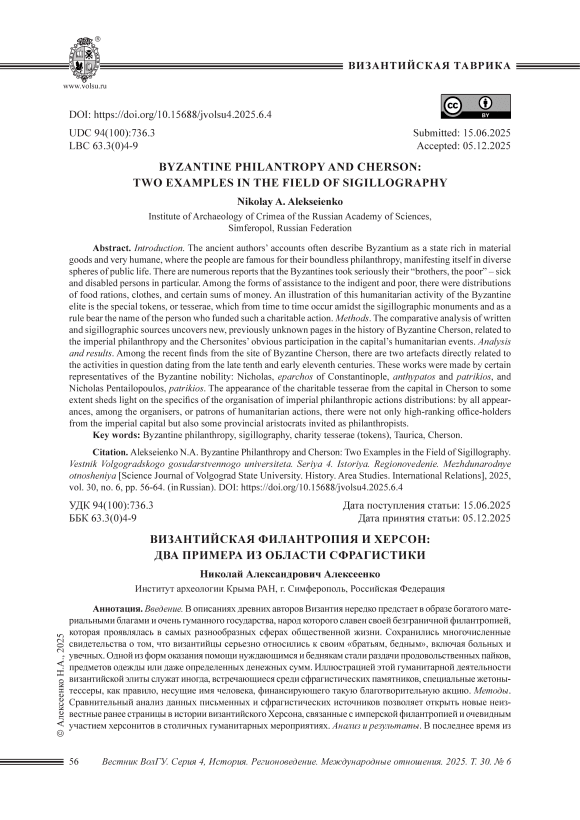 Введение. В описаниях древних авторов Византия нередко предстает в образе богатого материальными благами и очень гуманного государства, народ которого славен своей безграничной филантропией, которая проявлялась в самых разнообразных сферах общественной жизни. Сохранились многочисленные свидетельства о том, что византийцы серьезно относились к своим «братьям, бедным», включая больных и увечных. Одной из форм оказания помощи нуждающимся и беднякам стали раздачи продовольственных пайков, предметов одежды или даже определенных денежных сумм. Иллюстрацией этой гуманитарной деятельности византийской элиты служат иногда, встречающиеся среди сфрагистических памятников, специальные жетоны-тессеры, как правило, несущие имя человека, финансирующего такую благотворительную акцию. Методы. Сравнительный анализ данных письменных и сфрагистических источников позволяет открыть новые неизвестные ранее страницы в истории византийского Херсона, связанные с имперской филантропией и очевидным участием херсонитов в столичных гуманитарных мероприятиях. Анализ и результаты. В последнее время из находок на территории византийского Херсона стали известны два артефакта, имеющие непосредственное отношение к осуществлению подобной деятельности в конце Х – начале XI в. некоторыми представителями византийского нобилитета: константинопольским эпархом, анфипатом и патрикием Николаем и патрикием Николаем Пентаилопулосом. Появление столичных благотворительных тессер в Херсоне в какой-то мере проливает свет и на специфику организации имперских филантропических акций-раздач: по всей видимости, организаторами-соучастниками гуманитарных акций могли быть не только высокопоставленные столичные вельможи, но и некоторые провинциальные аристократы в качестве приглашенных меценатов.
