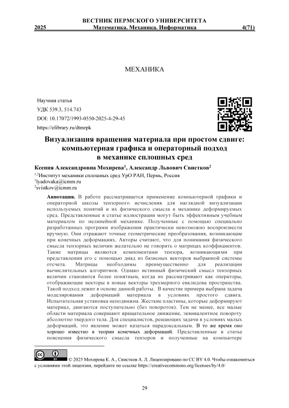В работе рассматривается применение компьютерной графики и операторной школы тензорного исчисления для наглядной визуализации используемых понятий и их физического смысла в механике деформируемых сред. Представленные в статье иллюстрации могут быть эффективным учебным материалом по нелинейной механике. Полученные с помощью специально разработанных программ изображения практически невозможно воспроизвести вручную. Они отражают точные геометрические преобразования, возникающие при конечных деформациях. Авторы считают, что для понимания физического смысла тензорных величин желательно не говорить о матрицах коэффициентов. Такие матрицы являются компонентами тензора, возникающими при представлении его с помощью диад из базисных векторов выбранной системы отсчета. Матрицы необходимы преимущественно для реализации вычислительных алгоритмов. Однако истинный физический смысл тензорных величин становится более понятным, когда их рассматривают как операторы, отображающие векторы в новые векторы трехмерного евклидова пространства. Такой подход лежит в основе данной работы. В качестве примера выбрана задача моделирования деформаций материала в условиях простого сдвига. Испытательная установка неподвижна. Жесткие пластины, которые деформируют материал, двигаются поступательно (без поворотов). Тем не менее, все малые области материала совершают вращательное движение, эквивалентное повороту абсолютно твердого тела. Для специалистов, решающих задачи в условиях малых деформаций, это явление может казаться парадоксальным. В то же время оно хорошо известно в теории конечных деформаций. Представленные в статье пояснения физического смысла тензоров и полученные на компьютере иллюстрации позволяют разрешить это кажущееся противоречие. Тем самым подчеркиваются преимущества операторного подхода в преподавании и изучении нелинейной теории конечных деформаций.