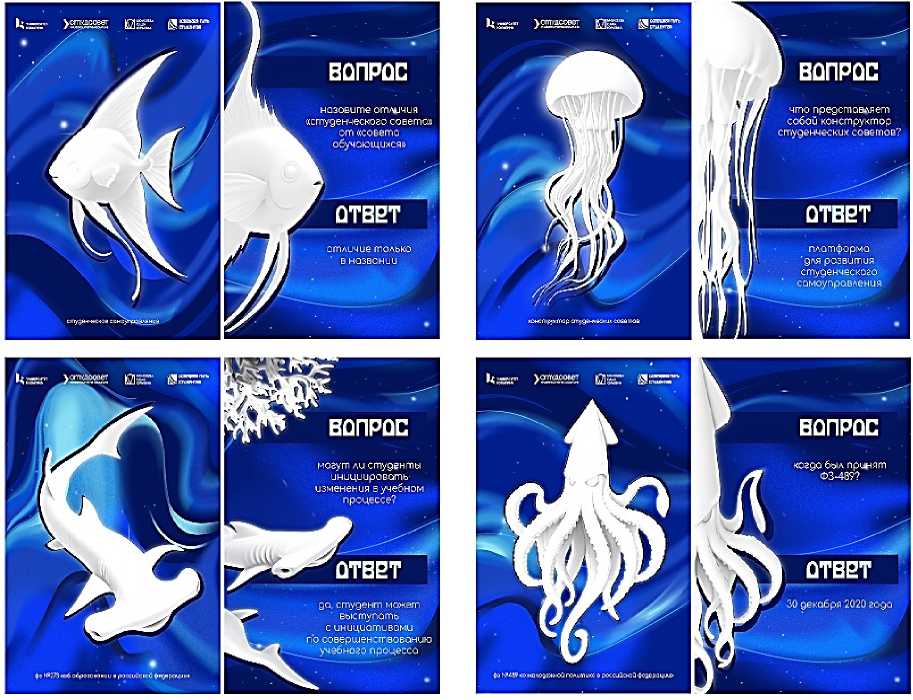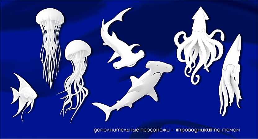 Важным элементом визуальной системы стали персонажи-маскоты, сопровождающие участников на протяжении всего образовательного проекта и самой игры. В качестве маскотов были разработаны морские существа: скалярия, рыба-молот, медуза и кальмар (Рисунок 3).