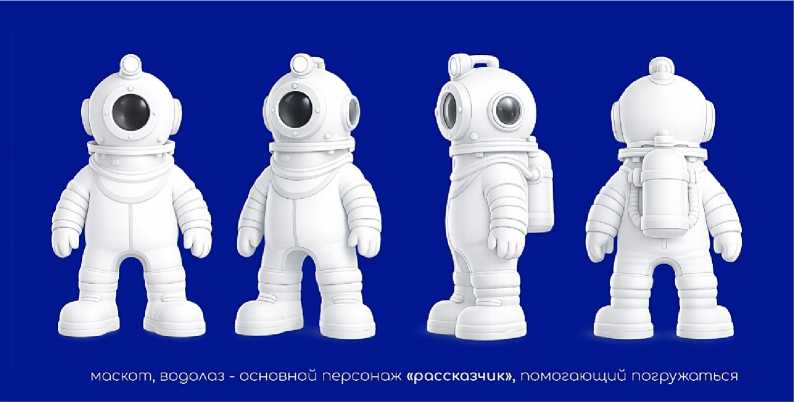 Каждый из них ассоциируется с определённой тематической категорией игры и помогает игрокам легче ориентироваться в структуре заданий. Использование маскотов выполняет одновременно несколько функций: упрощает визуальную навигацию, создаёт эмоциональную связь с участниками и формирует запоминающийся образ проекта. Центральным персонажем игры выступает водолаз – условный проводник, который символически «освещает путь студентам» в процессе освоения новых знаний. Данный образ напрямую связан с названием проекта и выступает метафорой сопровождения и поддержки студентов в образовательной среде (Рисунок 4).
