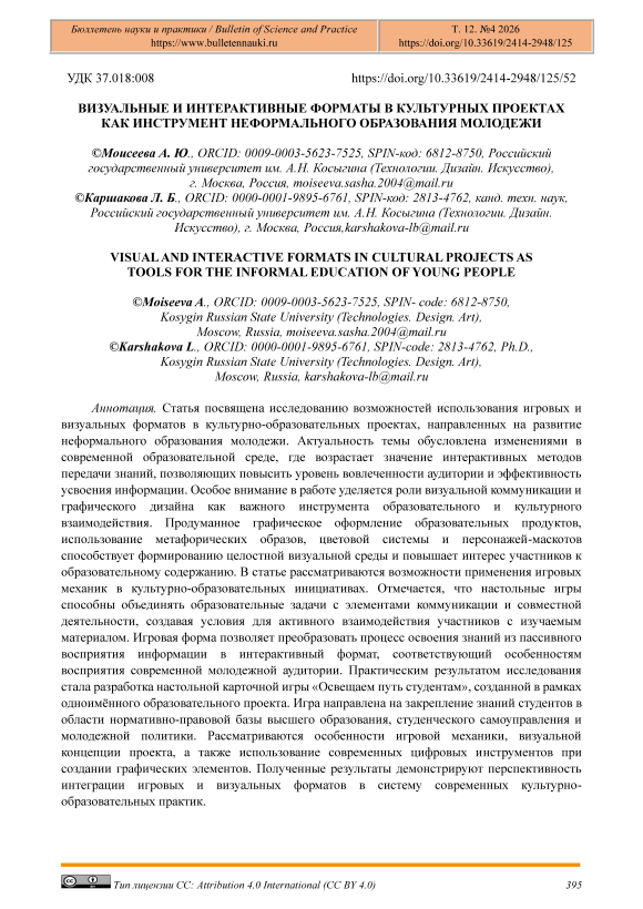 The article is devoted to the study of the possibilities of using game and visual formats in cultural and educational projects aimed at developing informal education for young people. The relevance of the topic is due to the changes in the modern educational environment, where the importance of interactive methods of knowledge transfer is increasing, allowing to increase the level of audience engagement and the effectiveness of information assimilation. Special attention is paid to the role of visual communication and graphic design as an important tool for educational and cultural interaction. Well-thought-out graphic design of educational products, the use of metaphorical images, color systems, and mascot characters contribute to the formation of a holistic visual environment and increase the interest of participants in educational content. The article discusses the possibilities of using game mechanics in cultural and educational initiatives. It is noted that board games can combine educational tasks with elements of communication and collaboration, creating conditions for active interaction between participants and the material being studied. The game form allows for the transformation of the learning process from passive information perception to an interactive format that is more suitable for the modern youth audience. The practical result of the research was the development of the board card game "Illuminating the Path for Students," which was created as part of the educational project of the same name. The game aims to reinforce students' knowledge of the legal framework for higher education, student self-governance, and youth policy. The article discusses the features of game mechanics, the visual concept of the project, and the use of modern digital tools in creating graphic elements. The features of game mechanics, the visual concept of the project, and the use of modern digital tools in creating graphic elements are considered. The results demonstrate the potential for integrating game and visual formats into modern cultural and educational practices.