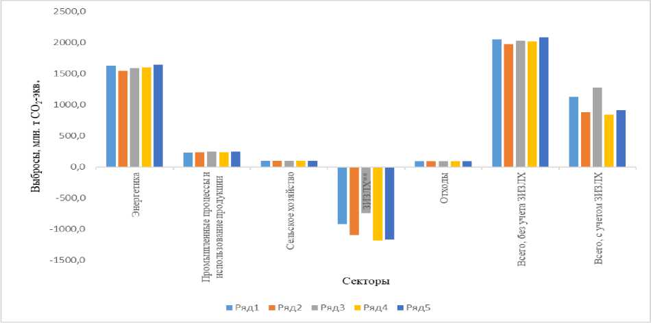 Рис. 1. Динамика выбросов и поглощения парниковых газов в РФ в разрезе секторов МГЭИК, где ряд 1 – 2019, ряд 2 – 2020, ряд 3 – 2021, ряд 4 – 2022, ряд 5 – 2023 гг. Отрицательные значения соответствуют поглощению парниковых газов из атмосферы