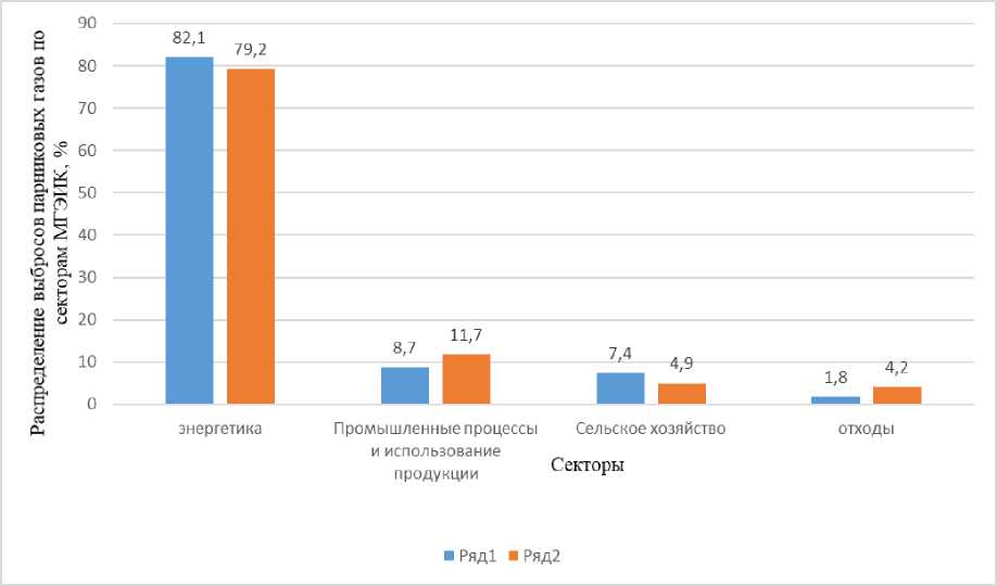 Рис. 2. Распределение выбросов парниковых газов по секторам МГЭИК, без учета сектора ЗИЗЛХ, %, где ряд 1 – 1990, ряд 2 – 2023 гг.