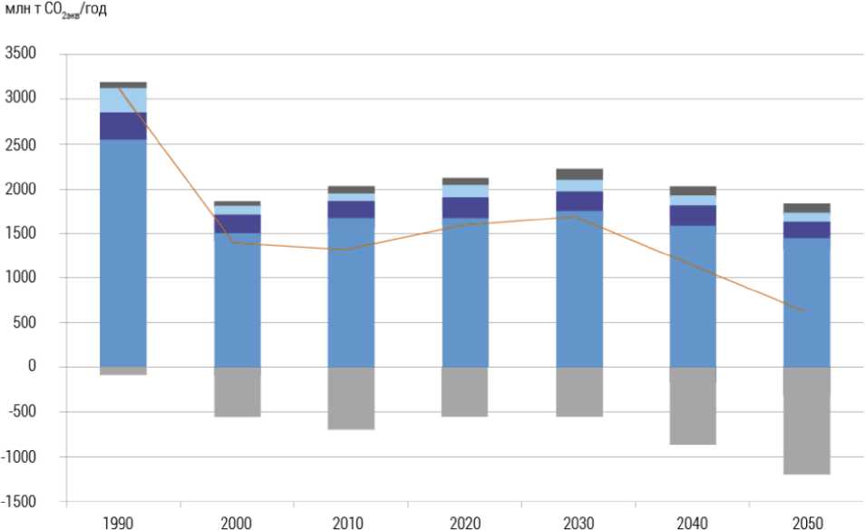 Рис. 3. Динамика выбросов и поглощения парниковых газов (в пересчете на диоксид углерода) из различных источников в России по целевому сценарию Стратегии низкоуглеродного развития (Стратегия социально-экономического развития Российской Федерации с низким уровнем выбросов парниковых газов до 2050 года. Утв. Расп. Правительства РФ от 29 октября 2021 г. № 3052-р)