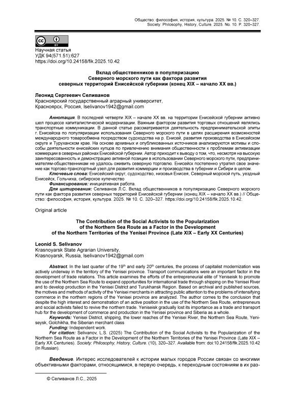 В последней четверти XIX – начале XX вв. на территории Енисейской губернии активно шел процессе капиталистической модернизации. Важным фактором развития торговых отношений являлись транспортные коммуникации. В данной статье рассматривается деятельность предпринимательской элиты г. Енисейска по популяризации использования Северного морского пути в целях расширения возможностей международного товарообмена посредством судоходства на р. Енисей, развития производства в Енисейском округе и Туруханском крае. На основе архивных и опубликованных источников анализируются мотивы и способы деятельности енисейских купцов по привлечению внимания общественности к проблемам активизации коммерции в северных районах Енисейской губернии. Автор приходит к выводу о том, что, несмотря на высокую заинтересованность и демонстрацию активной позиции в использовании Северного морского пути, предпринимателям-общественникам не удалось оживить северную торговлю. Енисейск постепенно утратил свое значение как торгово-транспортный узел для развития коммерции и производства в губернии и Сибири в целом.