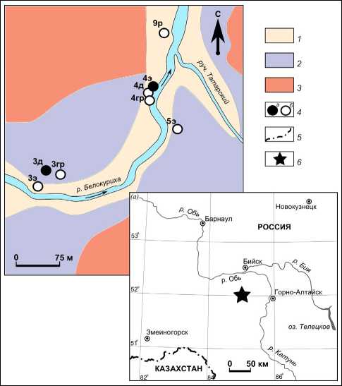 1 – Alluvial water distribution zone; 2 – zone of distribution of cold fissure waters of granites; 3 – zone of distribution of granites thermal fissure waters; 4 – wells and their numbers: a – tested; b – production and exploration; 5 – state border of the Russian Federation; 6 – Belokurikhinskoye thermal water deposit руя соединения даже с очень близкой структурой [4, 5, 36]. Анализ проводился в лаборатории ИКАРП ДВО РАН на газовом хромато-масс-спек-трометре Shimadzu GCMS-QP2010Ultra.