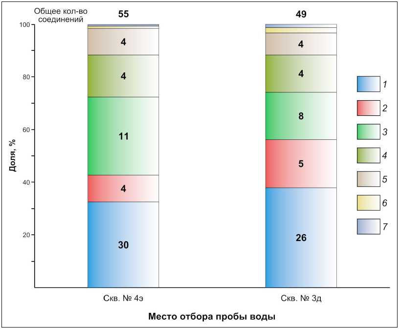 Обращает на себя внимание наличие кетона, содержащего трет-бутильную группу. Эта группа не синтезируется в живом мире и ее присутствие среди ОВ может указывать на локальное техногенное загрязнение. На это же указывает наличие хлорида додекановой кислоты, идентифицированного только в скважине № 4э с небольшим относительным содержанием (0.7%). Хлор-УВ не синтезируются микроорганизмами, и их присутствие может указывать на антропогенное загрязнение этих вод (галогенсодержащие УВ находятся, на- пример, в пестицидах).