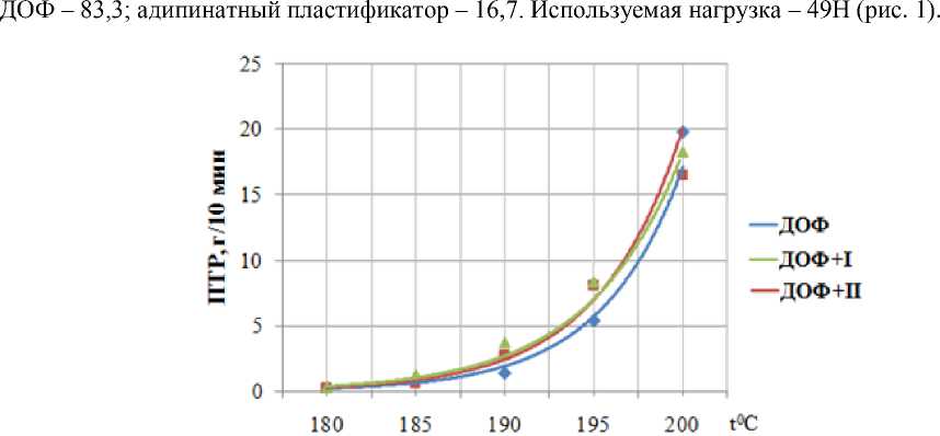 Исследование показало, что при содержании пластификатора адипината в количестве 50 масс. ч. компаунды характеризуются несколько более высокими значениями ПТР по сравнению с ДОФ (рис. 3). Кроме того, компаунды на основе пластификатора бутилбутоксиэтиладипи-ната проявляют более высокую текучесть.