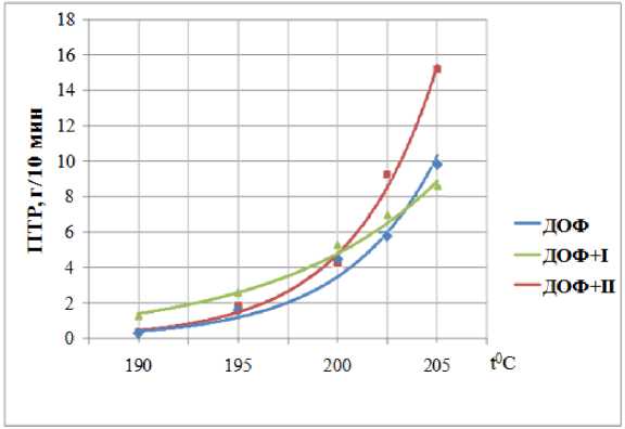 Достаточно надежный и широко распространенный на практике метод оценки технологичности - определение показателя текучести расплава (ПТР). Данный показатель позволяет установить температурный интервал переработки полимерной композиции и обеспечить необходимые условия для ее осуществления. Величина ПТР определяет основной технологический способ переработки полимерной композиции. Исследования проводились на установке ИИРТ-АМ в диапазоне температур от 160 до 205 °С.