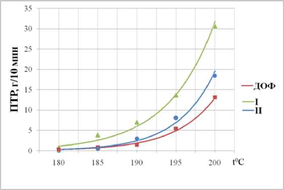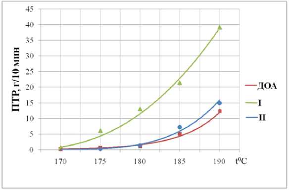 Исследованы температурные зависимости ПТР ПВХ-композиции для композиций следующего состава (масс. ч.): ПВХ - 100; пластификатор - 50; ТОСС - 1. Состав пластификатора, масс. ч.: