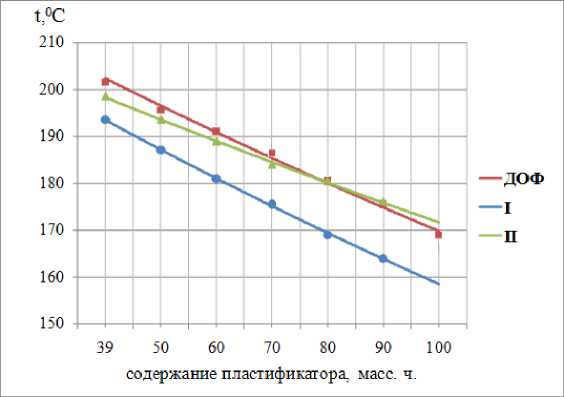 Экспериментально установлено, что для композитов на основе ПВХ с одинаковыми значениями ПТР, но содержащих разное количество пластификатора, температура и содержание пластификатора связаны линейной зависимостью (рис. 5). Коэффициент корреляции для всех рассмотренных образцов равен 0,99.