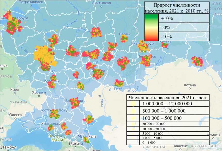 На рисунках 1, 2 приведена картограмма, отражающая общую численность населения в 2021 году (относительный размер окружности) и динамику численности населения за 2010– 2021 гг. (цвет: красный -10% за 10 лет, желтый 0%, зеленый +10%) во всех населенных пунктах, входящих в 40 городских агломераций России.