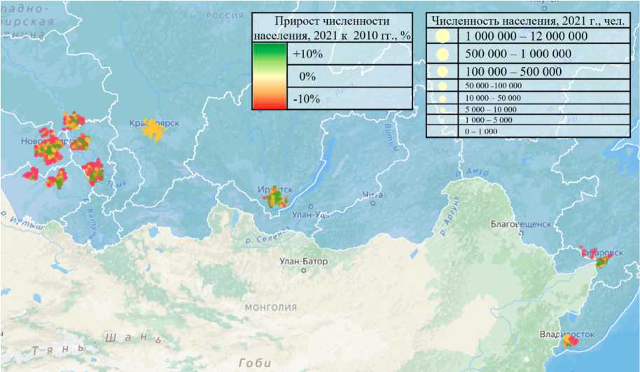 Рис. 2. Численность населения и ее динамика в населенных пунктах городских агломераций восточной части России за 2010–2021 гг.