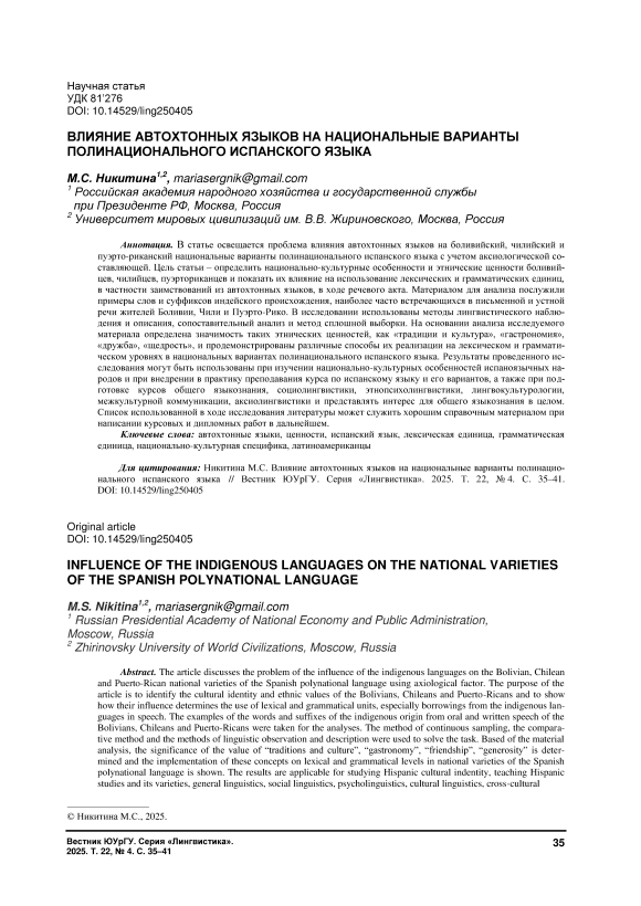 В статье освещается проблема влияния автохтонных языков на боливийский, чилийский и пуэрто-риканский национальные варианты полинационального испанского языка с учетом аксиологической составляющей. Цель статьи – определить национально-культурные особенности и этнические ценности боливийцев, чилийцев, пуэрториканцев и показать их влияние на использование лексических и грамматических единиц, в частности заимствований из автохтонных языков, в ходе речевого акта. Материалом для анализа послужили примеры cлов и суффиксов индейского происхождения, наиболее часто встречающихся в письменной и устной речи жителей Боливии, Чили и Пуэрто-Рико. В исследовании использованы методы лингвистического наблюдения и описания, сопоставительный анализ и метод сплошной выборки. На основании анализа исследуемого материала определена значимость таких этнических ценностей, как «традиции и культура», «гастрономия», «дружба», «щедрость», и продемонстрированы различные способы их реализации на лексическом и грамматическом уровнях в национальных вариантах полинационального испанского языка. Результаты проведенного исследования могут быть использованы при изучении национально-культурных особенностей испаноязычных народов и при внедрении в практику преподавания курса по испанскому языку и его вариантов, а также при подготовке курсов общего языкознания, социолингвистики, этнопсихолингвистики, лингвокультурологии, межкультурной коммуникации, аксиолингвистики и представлять интерес для общего языкознания в целом. Список использованной в ходе исследования литературы может служить хорошим справочным материалом при написании курсовых и дипломных работ в дальнейшем.