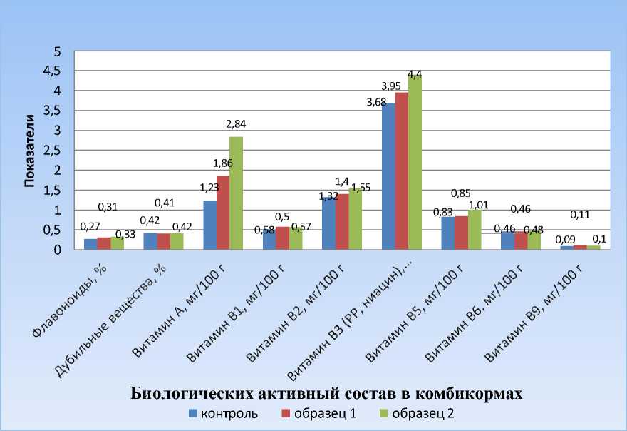 Рисунок 1. Результаты анализа содержания биологически активных веществ в образцах комбикорма