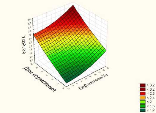 Рисунок 2. Поверхность отклика (удой; л) в зависимости от содержания БАДа и количества дней кормления