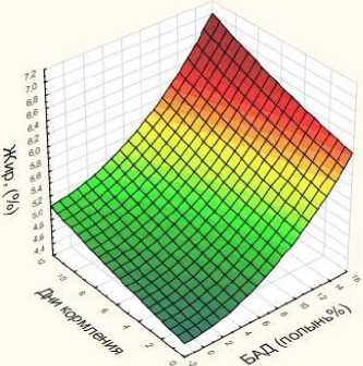 На рисунках - 2,3,4 представлены 3D-графики поверхностного отклика в зависимости от содержания БАД (из полыни, %) и количества дней кормления.