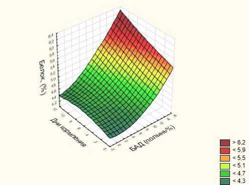 Рисунок 4. Поверхность отклика (белок; %) в зависимости от содержания БАДа и количества дней кормления