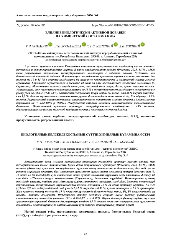 Қазақстанның қуаң климат жағдайында інгендердің өнімділігін арттыру жемнің сапасы мен теңгерімділігімен тығыз байланысты. Бұған дейін жарияланған зерттеуде (Processes, 2025, 13(10), 3362) полынь (Artemisia) қосылған экструдталған құрамажемнің технологиясы биологиялық белсенді қоспа ретінде әзірленген болатын. Осы зерттеуде құрамажем құрамындағы полыньдің әртүрлі дозаларының (0, 10 және 15 %) інгендердің сүт өнімділігіне және сүттің химиялық құрамына әсері бағаланды. Жемдеу 10 күн бойы «Шынғыс» шаруа қожалығының (Сарыағаш қ.) базасында жүргізілді. Мониторингке сүттің тәуліктік сауымы, майдың, ақуыздың және құрғақ заттардың массалық үлесі кірді. Зерттеу нәтижелері көрсеткендей, экструдталған құрамажемдегі полынь мөлшерін 15 %-ға дейін арттыру сауымды 1,0 л-ге (1,9-дан 2,9 л-ге дейін) көбейтті, май үлесін 0,62 %, ақуызды – 0,56 %, құрғақ заттарды – 1,8 % арттырды. Жем құрамын талдау полыньдің 15 % қосылған нұсқасында флавоноидтар мен А, B1, B3 дәрумендерінің ең жоғары деңгейін анықтады. Регрессиялық талдау қоспаның әсерінің және жемдеу ұзақтығының статистикалық мәнділігін растады (R² = 0,92–0,97; p < 0,001). Жауап беттері факторлардың оң өзара әрекеттесуін көрсетті. Оптималды рецептура ретінде 15 % полынь қосылған экструдталған құрамажем анықталды, ол інгендердің сүт өнімділігін және сүт сапасын жақсартуға мүмкіндік береді.