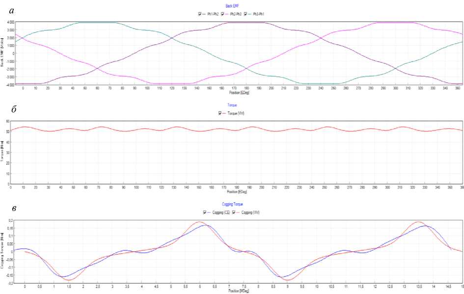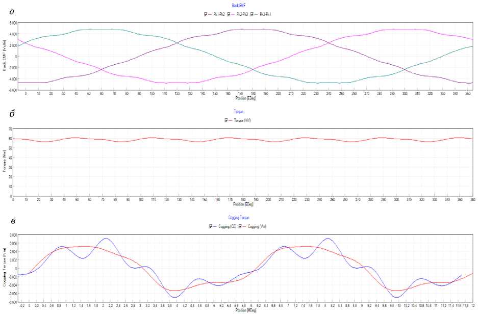 Fig. 3. Results for the 36-slot configuration: а – back EMF; б – electromagnetic torque; в – cogging torque