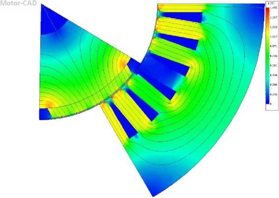 Рис. 6. Распределение магнитной индукции в модели с 48 пазами Fig. 6. Magnetic flux distribution in the 48-slot model