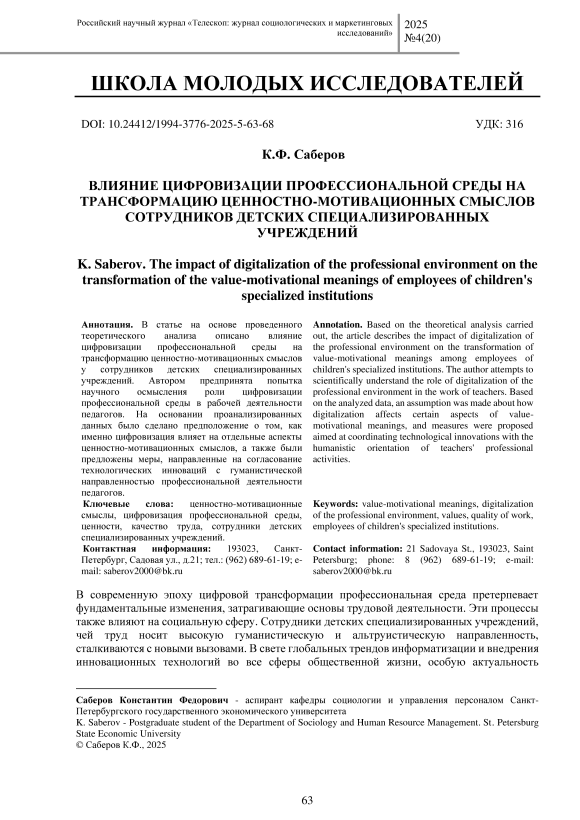 Влияние цифровизации профессиональной среды на трансформацию ценностно-мотивационных смыслов сотрудников детских специализированных учреждений