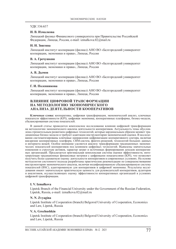 Кооперативы, цифровая трансформация, экономический анализ, ключевые показатели эффективности (KPI), цифровая экономика, кооперативные платформы, бизнес-модели, сбалансированная система показателей