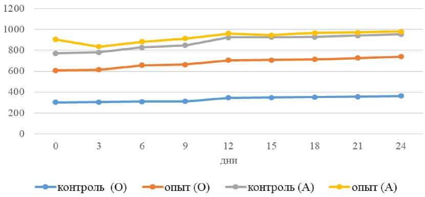 Средняя исходная концентрация аргинин-вазотоцин в плазме у шести случайно выбранных птиц (0 сутки) составила 8,17±0,13. В период адаптации к высокосолевому рациону концентрация аргинин-вазотоцина в плазме крови птиц опытной группы возрастала.