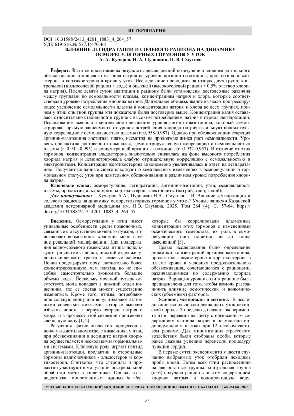 В статье представлены результаты исследований по изучению влияния длительного обезвоживания и пищевого хлорида натрия на уровень аргинин-вазотоцина, пролактина, альдостерона и кортикостерона в крови у уток. Исследование проводили на птицах двух групп: контрольной (низкосолевой рацион + вода) и опытной (высокосолевой рацион + 0,5% раствор хлорида натрия). После девяти суток адаптации к рациону были установлены достоверные различия между группами по осмоляльности плазмы, концентрациям натрия и хлора, которые соответствовали уровню потребления хлорида натрия. Длительное обезвоживание вызвало прогрессирующее увеличение осмоляльности плазмы и концентраций натрия и хлора во всех группах, причем у птиц опытной группы эти показатели были достоверно выше. Концентрация калия оставалась относительно стабильной в группе с высоким потреблением натрия в период дегидратации. Исследование выявило значительное повышение уровня аргинин-вазотоцина, который демонстрировал прямую зависимость от уровня потребления хлорида натрия и сильную положительную корреляцию с осмоляльностью плазмы (r=0,958-0,987). Однако при обезвоживании секреция аргинин-вазотоцина достигала плато, несмотря на продолжающийся рост осмоляльности. Уровень пролактина достоверно повышался, демонстрируя тесную корреляцию с осмоляльностью плазмы (r=0,911-0,995) и концентрацией аргинин-вазотоцина (r=0,932-0,957). В отличие от этих гормонов, концентрация альдостерона значительно снижалась на фоне высокого потребления хлорида натрия и демонстрировала слабую отрицательную корреляцию с осмоляльностью и электролитами. Концентрация кортикостерона закономерно увеличивалась в ответ на дегидратацию. Полученные данные свидетельствуют о комплексных изменениях в осморегуляции и гормональном статусе уток при длительном обезвоживании и различном уровне потребления хлорида натрия.