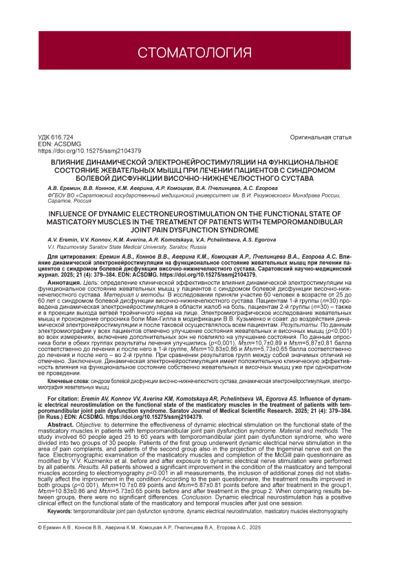 Цель: определение клинической эффективности влияния динамической электростимуляции на функциональное состояние жевательных мышц у пациентов с синдромом болевой дисфункции височно-нижнечелюстного сустава. Материал и методы. В исследовании приняли участие 60 человек в возрасте от 25 до 60 лет с синдромом болевой дисфункции височно-нижнечелюстного сустава. Пациентам 1-й группы (n=30) проведена динамическая электронейростимуляция в области жалоб на боль, пациентам 2-й группы (n=30) – также и в проекции выхода ветвей тройничного нерва на лице. Электромиографическое исследование жевательных мышц и прохождение опросника боли Мак-Гилла в модификации В.В. Кузьменко и соавт. до воздействия динамической электронейростимуляции и после таковой осуществлялось всем пациентам. Результаты. По данным электромиографии у всех пациентов отмечено улучшение состояния жевательных и височных мышц (p<0,001) во всех измерениях, включение дополнительных зон не повлияло на улучшение состояния. По данным опросника боли в обеих группах результаты лечения улучшились (p<0,001), M±m=10,7±0,89 и M±m=5,87±0,81 балла соответственно до лечения и после него в 1-й группе, M±m=10,83±0,86 и M±m=5,73±0,65 балла соответственно до лечения и после него – во 2-й группе. При сравнении результатов групп между собой значимых отличий не отмечено. Заключение. Динамическая электронейростимуляция имеет положительную клиническую эффективность влияния на функциональное состояние собственно жевательных и височных мышц уже при однократном ее проведении.