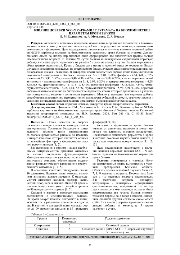 Активность обменных процессов, проходящих в организме отражается в биохимическом составе крови. Для диагностических целей часто определяют активность различных микроэлементов и ферментов. Цель исследования, заключалась в изучение влияния кормовой добавки NCG-N карбомил глутамат на биохимические параметры крови бычков на откорме. Для постановки опыта по методу пар-аналогов было сформировано две аналогичных группы бычков шестимесячного возраста. В течение 90 суток бычкам индивидуально скармливали кормовую добавку в составе дерти зерносмеси из расчёта 5 грамм на голову в сутки. Рацион кормления в обеих группах идентичный. Кровь отбирали раз в месяц из яремной вены до кормления. Биохимические показатели определяли на ветеринарном биохимическом анализаторе с использованием одноразовых дисков реагентов. В сыворотки крови подопытных бычков отмечалось увеличение показателей минерального обмена кальция на 5,53, 7,40, 6,20%, фосфора 4,54, 6,0, 7,70%, магния 6,25, 5,83, 5,55%, калия 3,40, 4,30, 4,40%, хлора 5,68, 6,28%, а также ферментативной активности аланинаминотрансферазы на 3,18, 5,95, 6,20% и аспартатаминотрансферазы 4,28, 5,95, 6,57%, креатининкиназы 5,13, 6,19, 8,40%, щелочной фосфотазы 5,42, 6,38, 7,84%, гаммаглутамилтранспептидазы 6,28, 7,14, 7,87%, глутаматдегидрогеназы 5,98, 8,90, 9,24%. Кормовая добавка оказывала влияние на биохимические параметры крови, которые проявлялись в увеличении минеральных веществ и активности ферментом. Можно утверждать, что кормовая добавка способствовала повышению ферментативной активности рубцовой жидкости, транспортировки и усвоению питательных веществ рациона организмом бычков в анаболических целях.