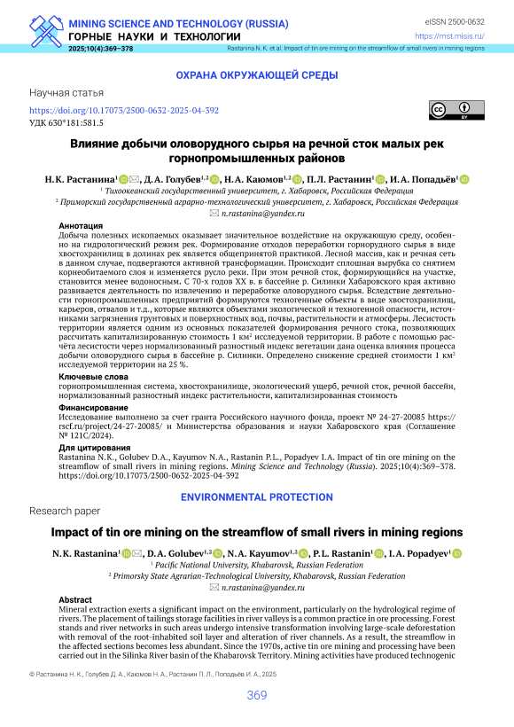 Добыча полезных ископаемых оказывает значительное воздействие на окружающую среду, особенно на гидрологический режим рек. Формирование отходов переработки горнорудного сырья в виде хвостохранилищ в долинах рек является общепринятой практикой. Лесной массив, как и речная сеть в данном случае, подвергаются активной трансформации. Происходит сплошная вырубка со снятием корнеобитаемого слоя и изменяется русло реки. При этом речной сток, формирующийся на участке, становится менее водоносным. С 70-х годов XX в. в бассейне р. Силинки Хабаровского края активно развивается деятельность по извлечению и переработке оловорудного сырья. Вследствие деятельности горнопромышленных предприятий формируются техногенные объекты в виде хвостохранилищ, карьеров, отвалов и т.д., которые являются объектами экологической и техногенной опасности, источниками загрязнения грунтовых и поверхностных вод, почвы, растительности и атмосферы. Лесистость территории является одним из основных показателей формирования речного стока, позволяющих рассчитать капитализированную стоимость 1 км2 исследуемой территории. В работе с помощью расчёта лесистости через нормализованный разностный индекс вегетации дана оценка влияния процесса добычи оловорудного сырья в бассейне р. Силинки. Определено снижение средней стоимости 1 км2 исследуемой территории на 25 %.