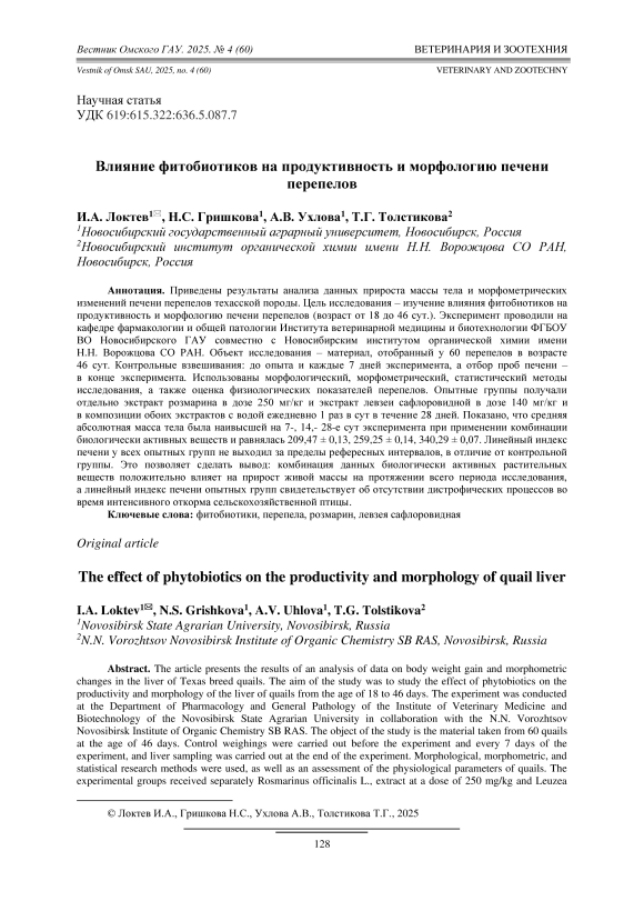 Приведены результаты анализа данных прироста массы тела и морфометрических изменений печени перепелов техасской породы. Цель исследования – изучение влияния фитобиотиков на продуктивность и морфологию печени перепелов (возраст от 18 до 46 сут.). Эксперимент проводили на кафедре фармакологии и общей патологии Института ветеринарной медицины и биотехнологии ФГБОУ ВО Новосибирского ГАУ совместно с Новосибирским институтом органической химии имени Н.Н. Ворожцова СО РАН. Объект исследования – материал, отобранный у 60 перепелов в возрасте 46 сут. Контрольные взвешивания: до опыта и каждые 7 дней эксперимента, а отбор проб печени – в конце эксперимента. Использованы морфологический, морфометрический, статистический методы исследования, а также оценка физиологических показателей перепелов. Опытные группы получали отдельно экстракт розмарина в дозе 250 мг/кг и экстракт левзеи сафлоровидной в дозе 140 мг/кг и в композиции обоих экстрактов с водой ежедневно 1 раз в сут в течение 28 дней. Показано, что средняя абсолютная масса тела была наивысшей на 7-, 14,- 28-е сут эксперимента при применении комбинации биологически активных веществ и равнялась 209,47 ± 0,13, 259,25 ± 0,14, 340,29 ± 0,07. Линейный индекс печени у всех опытных групп не выходил за пределы рефересных интервалов, в отличие от контрольной группы. Это позволяет сделать вывод: комбинация данных биологически активных растительных веществ положительно влияет на прирост живой массы на протяжении всего периода исследования, а линейный индекс печени опытных групп свидетельствует об отсутствии дистрофических процессов во время интенсивного откорма сельскохозяйственной птицы.