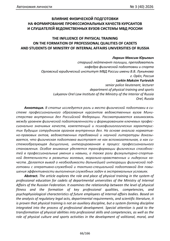 В статье исследуется роль и место физической подготовки в системе профессионального образования курсантов ведомственных вузов Министерства внутренних дел Российской Федерации. Рассматривается взаимосвязь между уровнем физической подготовленности и формированием ключевых профессионально значимых качеств, компетенций и психофизиологических характеристик будущих сотрудников органов внутренних дел. На основе анализа нормативно-правовых актов, ведомственных требований и научной литературы доказывается, что физическая подготовка выступает не как вспомогательная, а как системообразующая дисциплина, интегрированная в процесс профессионального становления. Особое внимание уделяется трансформации физических способностей в профессиональные умения и навыки, а также роли физкультурно-спортивной деятельности в развитии волевых, морально-нравственных и лидерских качеств. Делается вывод о необходимости дальнейшей интеграции физической подготовки с оперативно-служебной и тактико-специальной подготовкой для повышения эффективности выполнения служебных задач в экстремальных условиях.