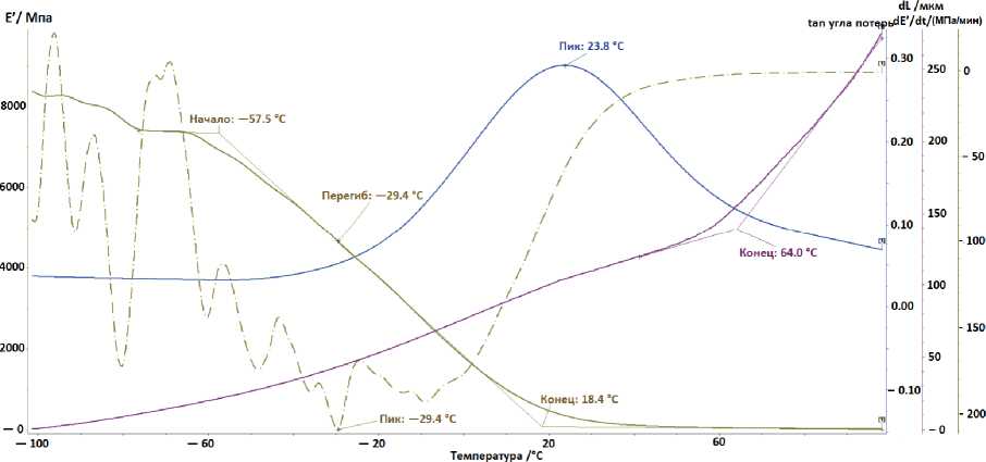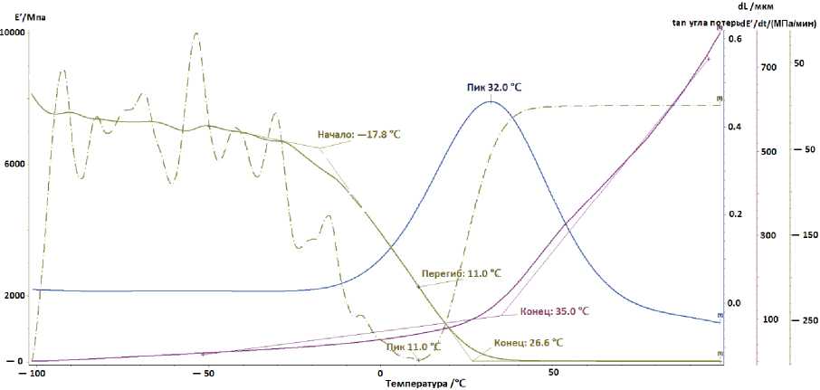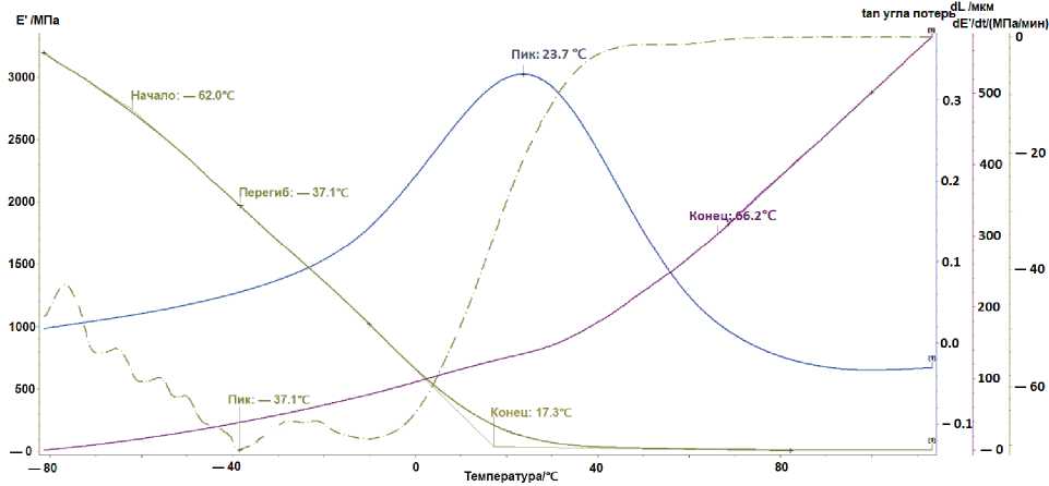 Тн – температура начала перехода из стеклообразного состояния в высокоэластическое; Тст – температура стеклования; Тк – температура конца перехода из стеклообразного состояния в высокоэластическое; Тк – Тн – интервал температур, соответствующий области α-релаксации; Е – модуль упругости.