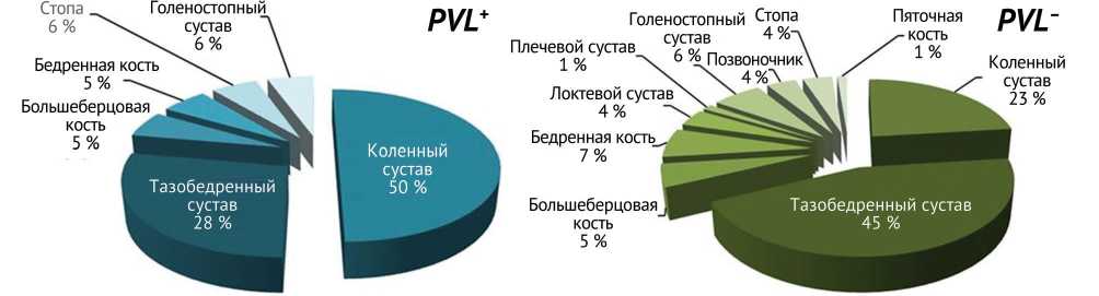 У пациентов с инфекцией, вызванной PVL + штаммами, в половине случаев регистрировали поражение коленного сустава ( n = 9), реже — тазобедренного. Напротив, в группе PVL – преобладала тенденция к поражению тазобедренного сустава, — 45 % случаев ( n = 35) (рис. 1). Распределение по локализациям у обеих групп показывает схожие тенденции с преобладанием поражения крупных суставов.