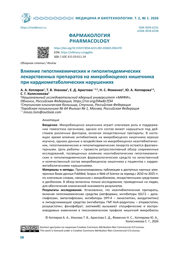 Введение. Микробиоценоз кишечника играет ключевую роль в поддержании гомеостаза организма, однако его состав может нарушаться под действием различных факторов, включая лекарственные препараты. В настоящее время влияние антибиотиков на микробиоценоз кишечника хорошо изучено, однако данные о воздействии на микробиоценоз неантибиотических, гипогликемических и гиполипидемических лекарств остаются фрагментарными. Цель работы – провести ретроспективный обзор современных исследований, посвященных влиянию неантибиотических гипогликемических и гиполипидемических фармакологических средств на качественный и количественный состав микробиоценоза кишечника у пациентов с кардиометаболическими нарушениями. Материалы и методы. Проанализированы публикации в доступных научных электронных базах данных PubMed, Researchgate, Scopus и Web of Science за период с 2010 по 2025 гг. по ключевым словам, связанным с микробиомом, лекарственными средствами и дисбиозом. В обзор включены только исследования, проведенные на людях, для обеспечения клинической значимости результатов. Результаты исследования. Установлено, что неантибиотические препараты, включая гипогликемические средства (метформин, ингибиторы SGLT2 – дапаглифлозин, эмпаглифлозин; ингибиторы DPP-4 – линаглиптин, вилдаглиптин) и липидснижающие средства (ингибиторы ГМГ-КоА-редуктазы – аторвастатин, розувастатин; фенофибрат; эзетимиб) вызывают специфические и воспроизводимые изменения в таксономическом профиле кишечной микробиоты у пациентов с метаболическими нарушениями. Наиболее значимые эффекты включают: увеличение Akkermansia muciniphila при приеме метформина и фенофибрата; рост Faecalibacterium prausnitzii и Bifidobacterium longum под действием ингибиторов SGLT2 и DPP-4; снижение α-разнообразия микробиоты при использовании статинов; и минимальные, но статистически достоверные сдвиги при приеме эзетимиба. Обсуждение и заключение. Установлено, что современные гипогликемические и гиполипидемические препараты обладают микробиом-модулирующим потенциалом. Некоторые из этих изменений (например, рост A. muciniphila и F. prausnitzii) могут частично объяснять терапевтические эффекты препаратов, включая улучшение чувствительности тканей к инсулину, снижение воспаления и защиту эндотелия. В то же время статины ассоциированы с умеренным дисбиозом, что требует учета при длительной терапии. Результаты подчеркивают необходимость интеграции микробиомного профилирования в персонализированный подход к лечению пациентов с сахарным диабетом 2 типа, дислипидемией и метаболическим синдромом. Требуются дальнейшие проспективные исследования для оценки клинической значимости выявленных микробиотических сдвигов и разработки стратегий их коррекции.