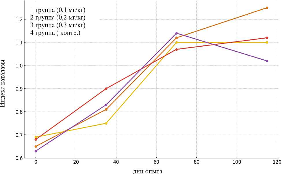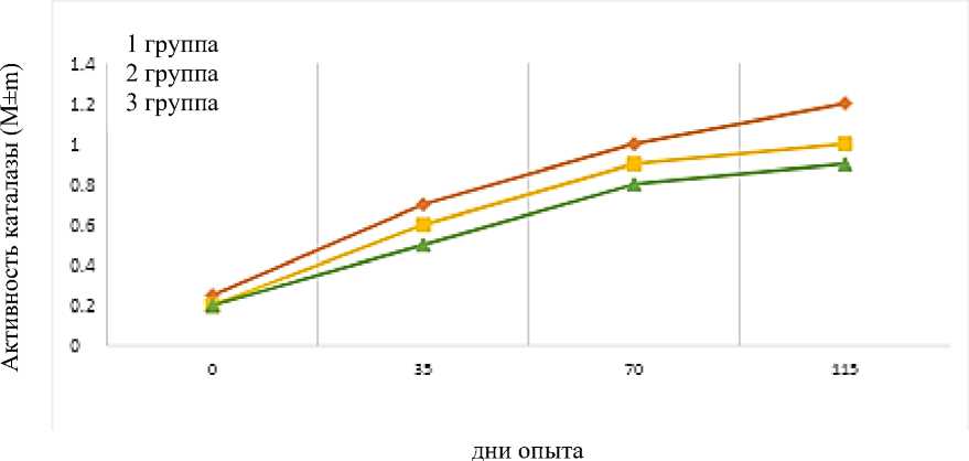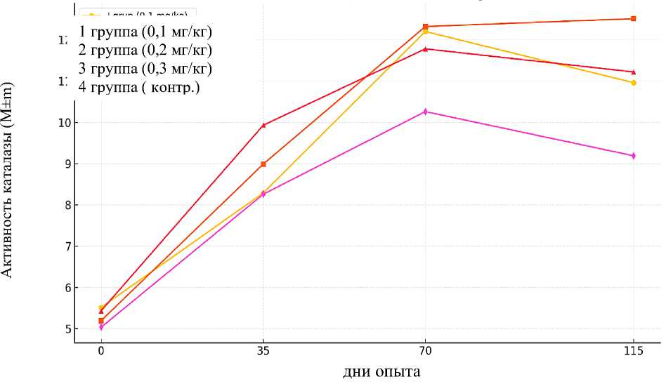 На 35 день кормления активность каталазы увеличилась во всех опытных группах по сравнению с контролем. Наибольший прирост наблюдался в группе III при дозе 0,3 мг/кг. Этот результат свидетельствует об эффективности более высоких доз в условиях дефицита кобальта в организме.