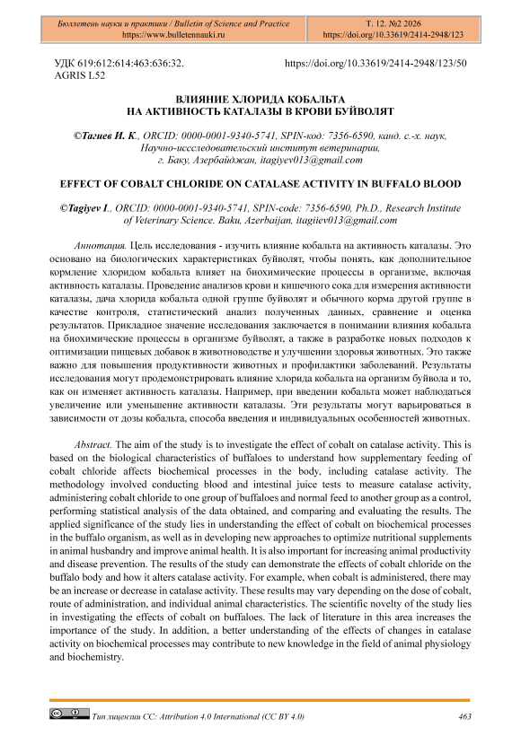 Цель исследования - изучить влияние кобальта на активность каталазы. Это основано на биологических характеристиках буйволят, чтобы понять, как дополнительное кормление хлоридом кобальта влияет на биохимические процессы в организме, включая активность каталазы. Проведение анализов крови и кишечного сока для измерения активности каталазы, дача хлорида кобальта одной группе буйволят и обычного корма другой группе в качестве контроля, статистический анализ полученных данных, сравнение и оценка результатов. Прикладное значение исследования заключается в понимании влияния кобальта на биохимические процессы в организме буйволят, а также в разработке новых подходов к оптимизации пищевых добавок в животноводстве и улучшении здоровья животных. Это также важно для повышения продуктивности животных и профилактики заболеваний. Результаты исследования могут продемонстрировать влияние хлорида кобальта на организм буйвола и то, как он изменяет активность каталазы. Например, при введении кобальта может наблюдаться увеличение или уменьшение активности каталазы. Эти результаты могут варьироваться в зависимости от дозы кобальта, способа введения и индивидуальных особенностей животных.