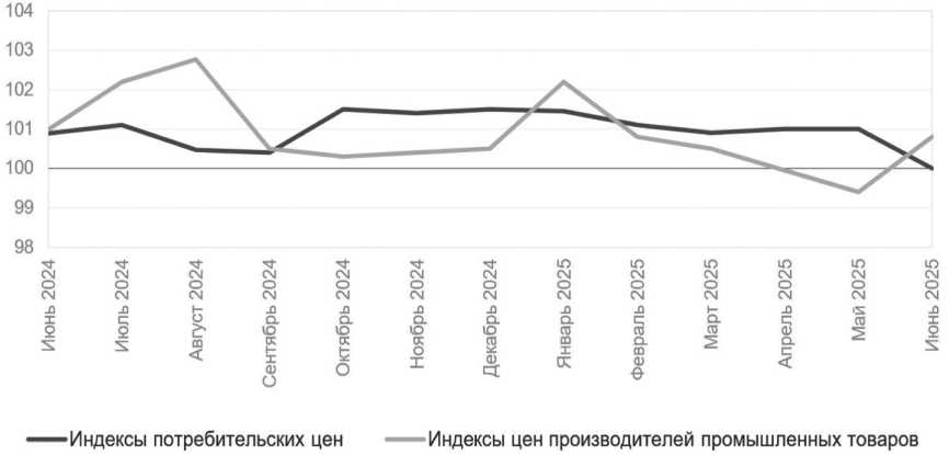 Индекс потребительских цен более стабилен: максимальное значение наблюдаем в октябре 2024 года (101,7 %), минимальное – в июне 2025 года (100 %).