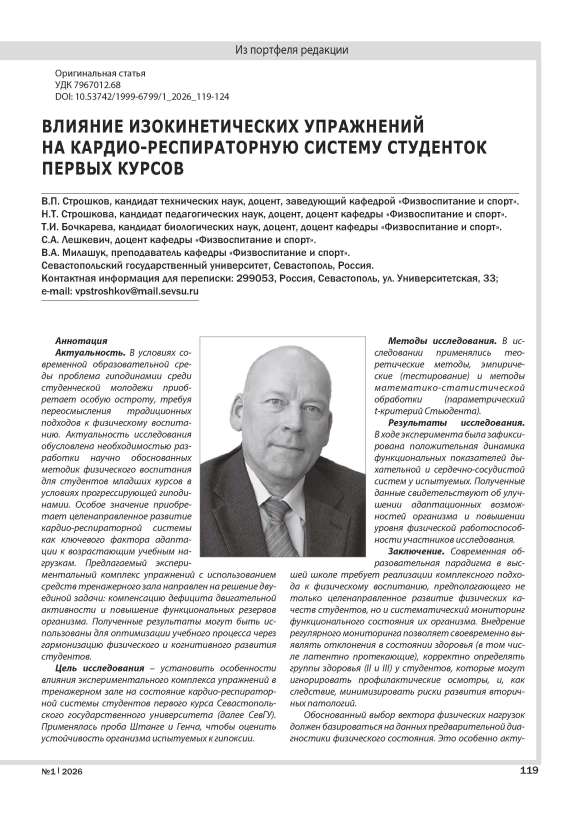 Актуальность. В условиях современной образовательной среды проблема гиподинамии среди студенческой молодежи приобретает особую остроту, требуя переосмысления традиционных подходов к физическому воспитанию. Актуальность исследования обусловлена необходимостью разработки научно обоснованных методик физического воспитания для студентов младших курсов в условиях прогрессирующей гиподинамии. Особое значение приобретает целенаправленное развитие кардио-респираторной системы как ключевого фактора адаптации к возрастающим учебным нагрузкам. Предлагаемый экспериментальный комплекс упражнений с использованием средств тренажерного зала направлен на решение двуединой задачи: компенсацию дефицита двигательной активности и повышение функциональных резервов организма. Полученные результаты могут быть использованы для оптимизации учебного процесса через гармонизацию физического и когнитивного развития студентов. Цель исследования – установить особенности влияния экспериментального комплекса упражнений в тренажерном зале на состояние кардио-респираторной системы студентов первого курса Севастопольского государственного университета (далее СевГУ). Применялась проба Штанге и Генча, чтобы оценить устойчивость организма испытуемых к гипоксии. Методы исследования. В исследовании применялись теоретические методы, эмпирические (тестирование) и методы математико-статистической обработки (параметрический t-критерий Стьюдента). Результаты исследования. В ходе эксперимента была зафиксирована положительная динамика функциональных показателей дыхательной и сердечно-сосудистой систем у испытуемых. Полученные данные свидетельствуют об улучшении адаптационных возможностей организма и повышении уровня физической работоспособности участников исследования. Заключение. Современная образовательная парадигма в высшей школе требует реализации комплексного подхода к физическому воспитанию, предполагающего не только целенаправленное развитие физических качеств студентов, но и систематический мониторинг функционального состояния их организма. Внедрение регулярного мониторинга позволяет своевременно выявлять отклонения в состоянии здоровья (в том числе латентно протекающие), корректно определять группы здоровья (II и III) у студентов, которые могут игнорировать профилактические осмотры, и, как следствие, минимизировать риски развития вторичных патологий. Обоснованный выбор вектора физических нагрузок должен базироваться на данных предварительной диагностики физического состояния. Это особенно актуально для студентов первого курса при распределении по элективным направлениям на втором семестре обучения. Дифференцированный подход, основанный на результатах объективного контроля, способствует укреплению соматического здоровья студенческой молодежи и создает предпосылки для повышения академической успеваемости.